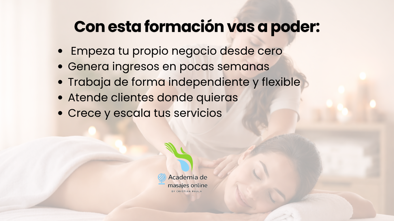 Aprendé masajes relajantes y descontracturantes, conocé el cuerpo humano y empezá a generar ingresos con tu propio servicio. Incluye técnicas, anatomía, ficha del paciente, armado del espacio, indicaciones y uso de aceites para brindar una experiencia profesional.